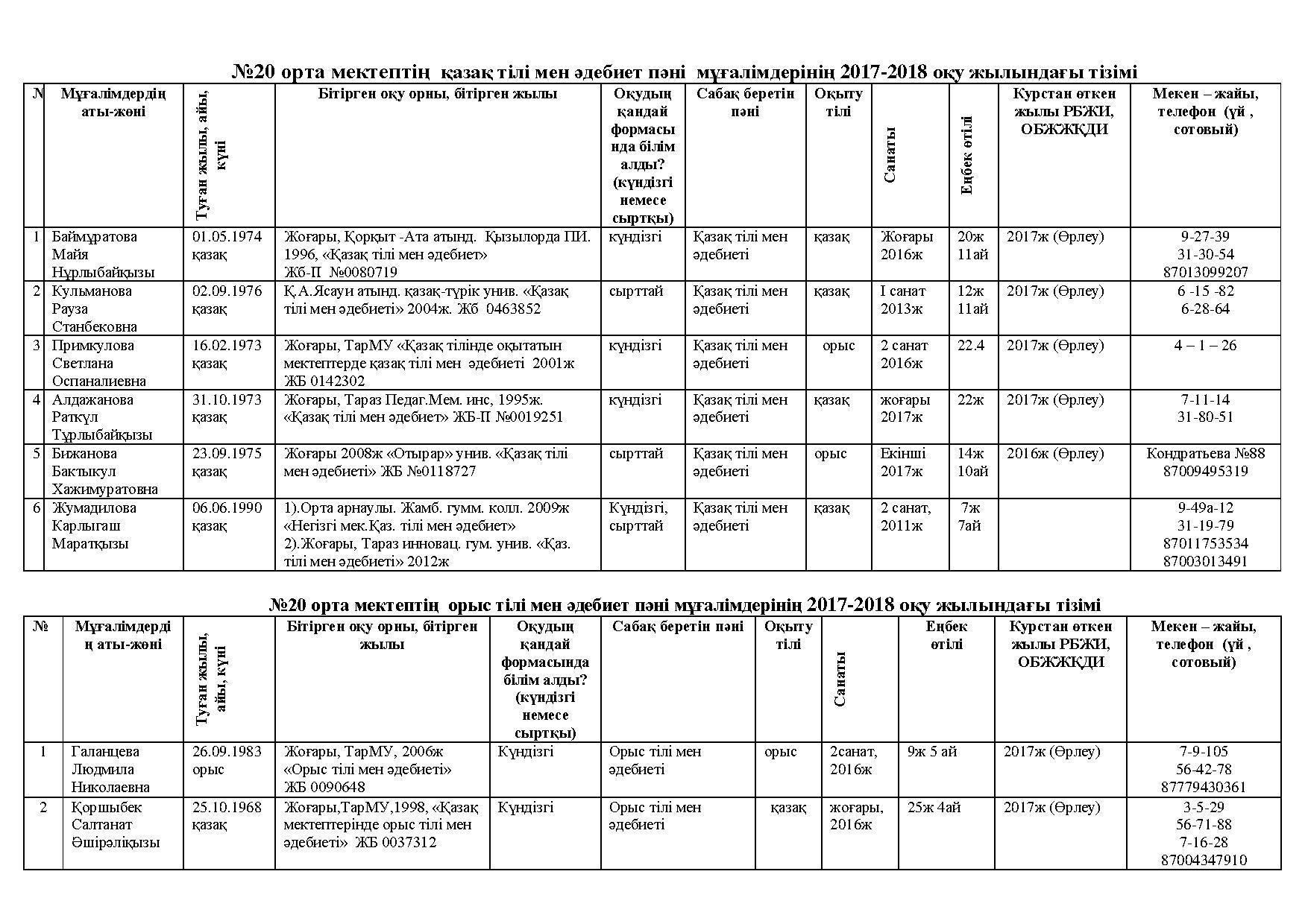 09 қазан 2017 0 1 2 3 4 5 №20 орта мектептің қазақ тілі мен әдебиет пәні мұғалімдерінің 2017-2018 оқу жылындағы тізімі
