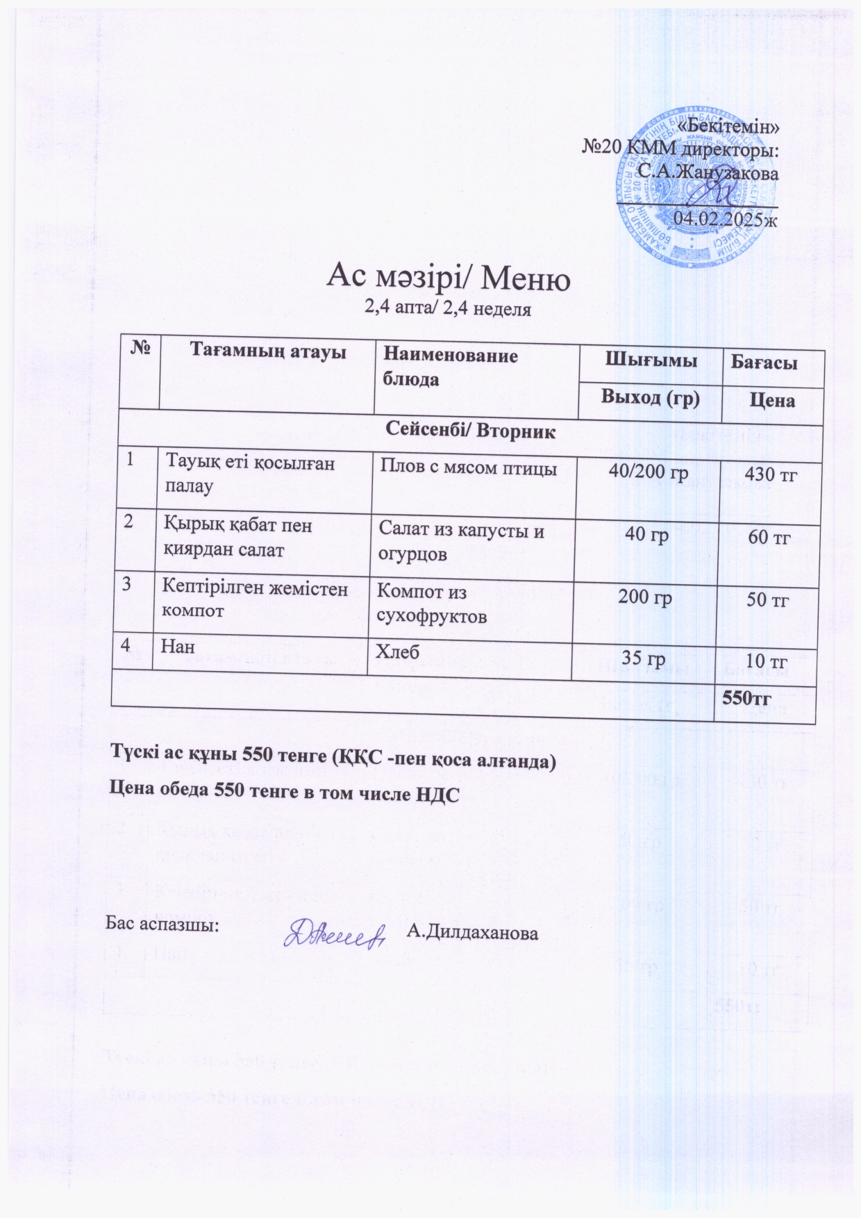 20 қаңтар 2025 20.01.2025ж Ас мәзірі