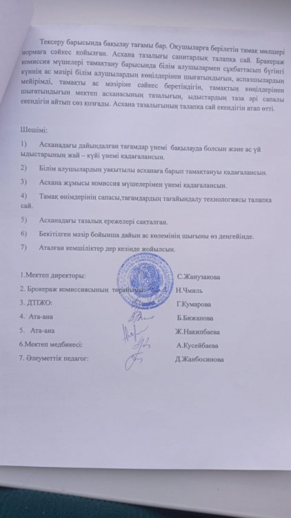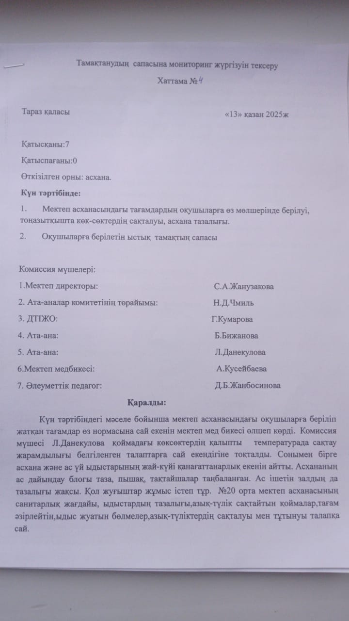 Тамақтанудың сапасына мониторинг жүргізуін тексеру » СШ №20